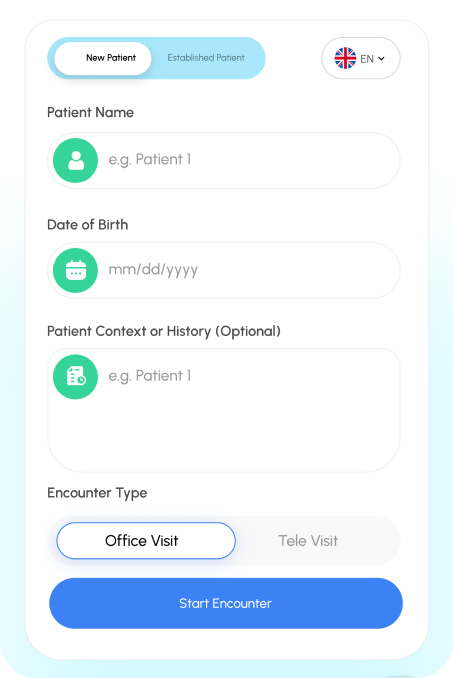 Enter the Patient Name and date of Birth and start the Encounter. If you are integrated with the EMR, you can directly pull the Patient from the EMR.