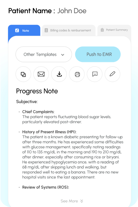 Automatically generates Billing codes (CPT, ICD-10, HCPC) from the patient encounter, helps with Medical coding precision and boost revenue.